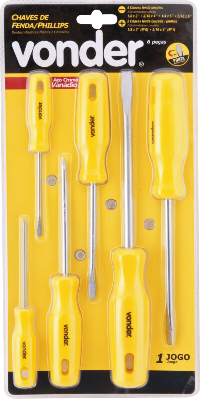 Jogo de chaves de fenda/phillips composto por 6 peças, sendo: 1 chave de fenda 1/8″ x 3″, 1 chave de fenda 3/16″ x 4″, 1 chave de fenda 1/4″ x 5″, 1 chave de fenda 5/16″ x 6″, 1 chave phillips 1/8″ x 3″ e 1 chave phillips 3/16″ x 4″.