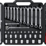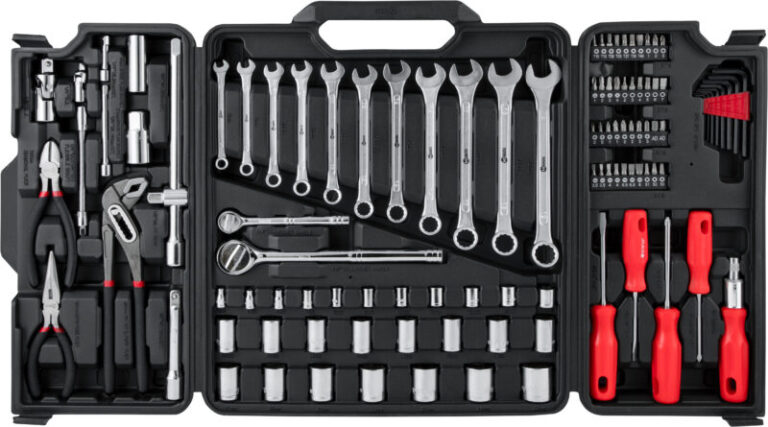 1 porta-chaves allen/hexagonais, 4 porta-bits, 1 alicate corte diagonal 6″, 1 alicate de bico meia-cana 6″, 1 alicate bomba d’água 10″, 2 chaves de fenda (5,0 mm x 75,0 mm (3/16″ x 3″) e 6,3 mm x 100,0 mm (1/4″ x 4″)), 2 chaves phillips (5,0 mm x 75,0 mm (N°1 – 3/16″ x 3″) e 6,3 mm x 100,0 mm (N°2 – 1/4″ x 4″)), 8 chaves allen/hexagonais (1,5 mm, 2,0 mm, 2,5 mm, 3,0 mm, 4,0 mm, 5,0 mm, 5,5 mm, 6,0 mm), 11 chaves combinadas (8,0 mm, 9,0 mm, 10,0 mm, 11,0 mm, 12,0 mm, 13,0 mm, 14,0 mm, 15,0 mm, 17,0 mm, 18,0 mm, 19,0 mm), 15 soquetes encaixe 1/2″ (10,0 mm, 11,0 mm, 12,0 mm, 13,0 mm, 14,0 mm, 15,0 mm, 17,0 mm, 18,0 mm, 19,0 mm, 20,0 mm, 21,0 mm, 22,0 mm, 23,0 mm, 24,0 mm, 27,0 mm), 1 catraca encaixe 1/2″, 1 extensão 5″ encaixe 1/2″, 1 junta universal encaixe 1/2″, 1 cabo T encaixe 1/2″ x 10″, 2 soquetes para vela de ignição (16,0 mm e 21,0 mm), 11 soquetes encaixe 1/4″ (4,0 mm, 5,0 mm, 6,0 mm, 7,0 mm, 8,0 mm, 9,0 mm, 10,0 mm, 11,0 mm, 12,0 mm, 13,0 mm, 14,0 mm), 1 catraca encaixe 1/4″, 1 extensão 2″ encaixe 1/4″, 1 extensão 4″ encaixe 1/4″, 1 extensão flexível 6″ encaixe 1/4″, 1 junta universal encaixe 1/4″, 1 cabo adaptador para bits com catraca encaixe 1/4″, bits fabricados com encaixe 1/4″ sendo: 7 chaves fenda (3,5 mm (2 peças), 4,0 mm (2 peças), 5,5 mm, 6,5 mm, 8,0 mm)), 8 chaves phillips (N°0, N°1, N°2, N°3 (2 peças cada)), 6 chaves allen (2,0 mm, 3,0 mm, 4,0 mm, 5,0 mm, 6,0 mm, 7,0 mm), 3 quadrados (S1, S2, S3), 7 chaves hexalobular (T10, T15, T20, T25, T27, T30, T40), 3 chave pozidrive (PZ1, PZ2, PZ3), 4 chaves três pontas (1, 2, 3, 4) e 2 adaptadores.