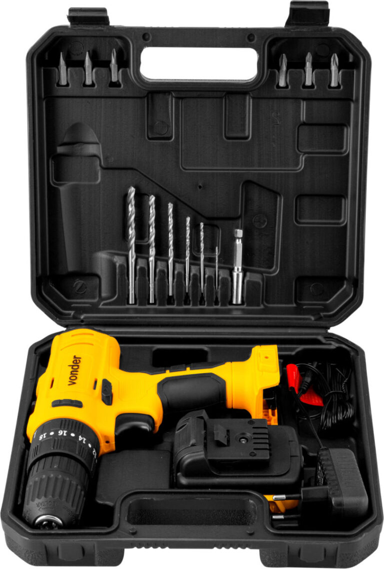 Acessórios/peças que acompanham o produto : 1 maleta, 1 bateria de 12 V, 1 fonte bivolt automática, 6 brocas de aço rápido (1,5 mm, 2,5 mm, 3 mm, 4 mm, 5 mm e 6 mm), 6 bits (2 fendas (5 mm e 6 mm), 2 phillips (PH1 e PH2) e 2 pozidrive (PZ1 e PZ2) e 1 soquete magnético com encaixe de 1/4″.