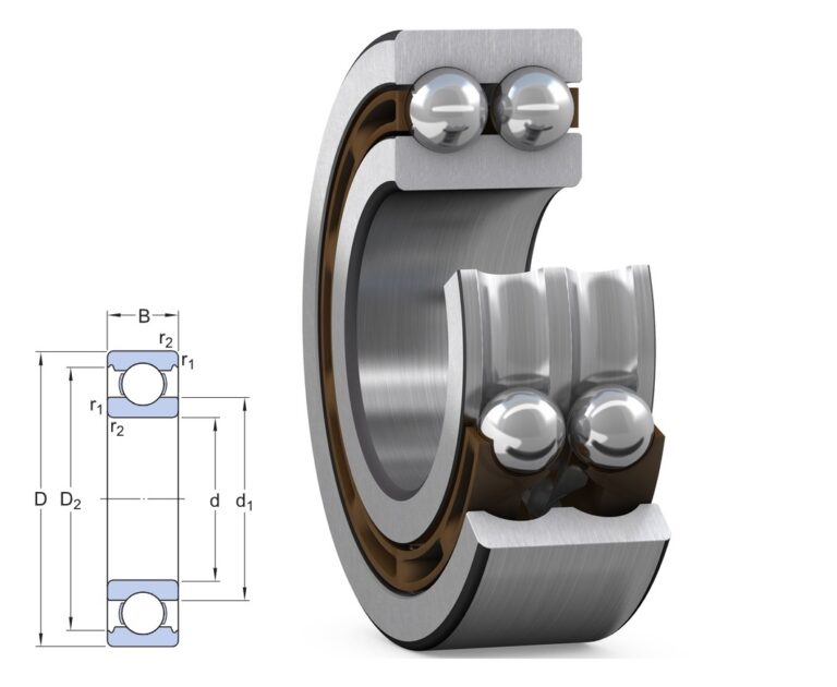 Rolamentos de dupla carreira de esferas possui menos espaço axial, pode ser usado para aplicações em que dois rolamentos de esferas de contato angular de uma carreira teriam restrições dimensionais. Suportam maiores cargas radiais e axiais em ambas direções e momentos de inclinação.